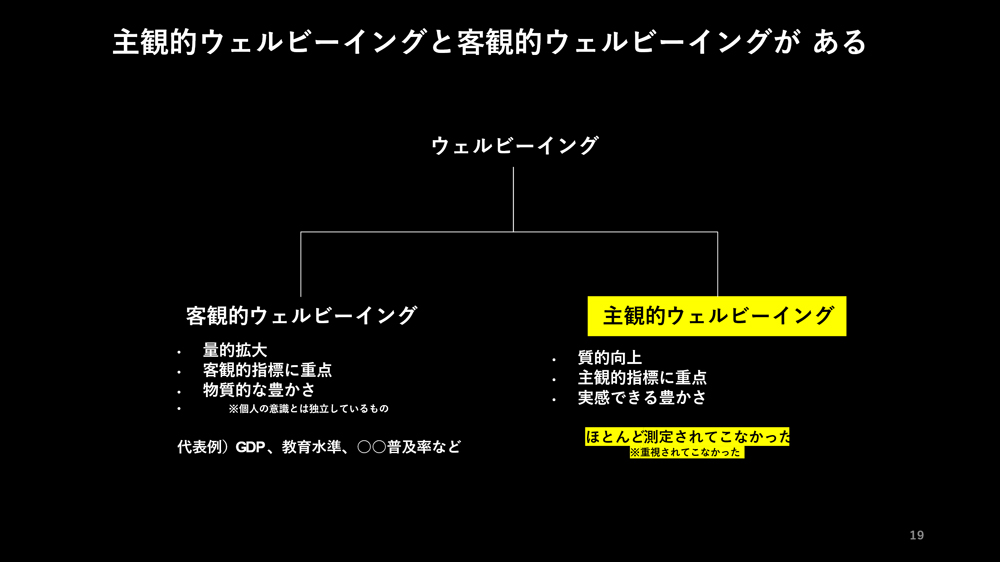 また、ウェルビーイングという言葉の使い分けとして、客観的ウェルビーイングと、主観的ウェルビーイングの2つに分類され説明されることが多く、客観的なウェルビーイングとはGDPのような「量的拡大」、「物質的な豊かさ」、一方で主観的なウェルビーイングとは「質的な向上」、「実感できる豊かさ」に分けられ、今、社会的に注目されているウェルビーイングとは、主観的ウェルビーイングのことを指しています。
