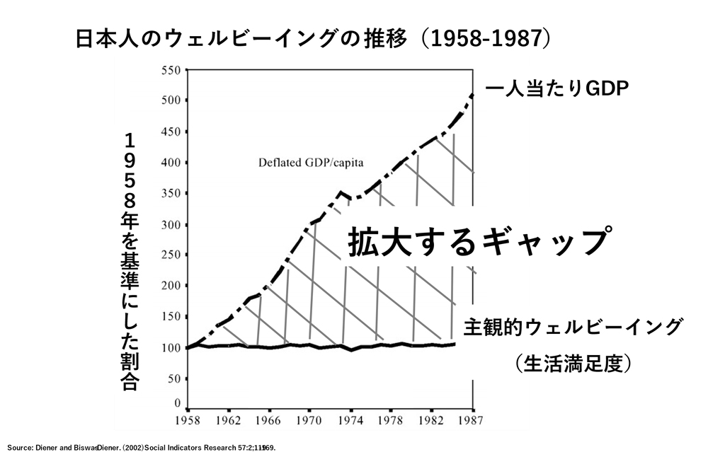 また、なぜ今この実感としての豊かさ(主観的ウェルビーイング)が注目されているかというと、経済的・物質的な豊かさと、人々の実感としての豊かさが乖離を起こしていることが挙げられます。