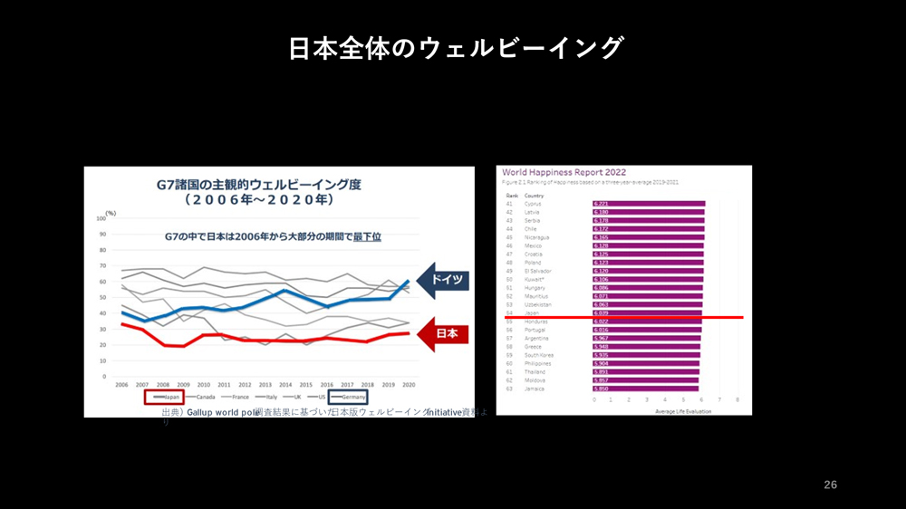 ちなみに、日本のウェルビーイングの状態ですが、G7では最低水準であり、国連が発行するワールドハピネスレポートにおいても決して高い順位ではありません。