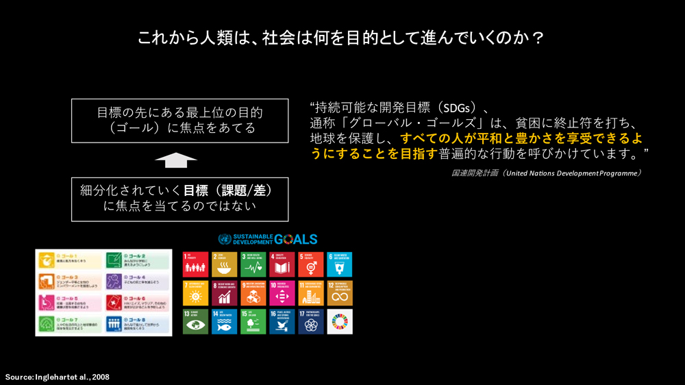 ウェルビーイングとは決して流行り言葉ではなく、長期的な社会の繁栄のための中核となる概念であると同時に、社会が目指す最上位の目的とも言えます。 世界経済フォーラムや国連でも、“ウェルビーイングに重点においた経済システムの再構築が必要である”という宣言がなされ、Beyond GDPとして、ウェルビーイングに関する枠組みの議論が、様々な分野、エリアにおいて起こっています。