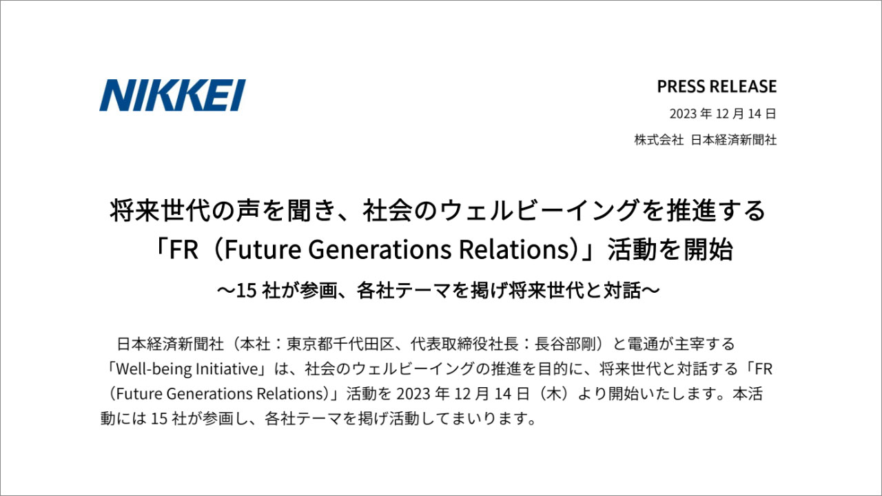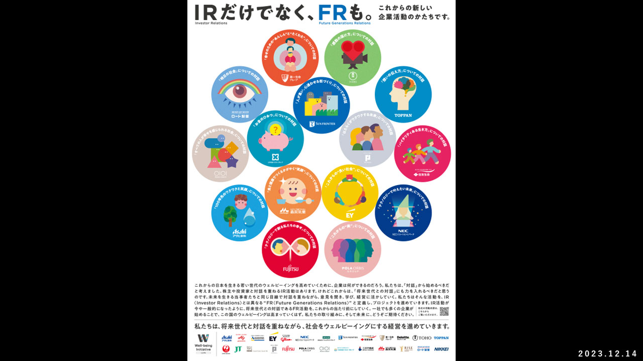 そこで、「Well-being Initiative」では、参画企業で連携し、重要なステークホルダーである株主・社員・顧客・取引先・地域住民などに、未来を担う「将来世代」を加え、継続的に対話をしていく「FR」活動の開始を2023年12月14日に共同宣言いたしました。「FR」は株主や投資家向けに行う活動「IR(Investor Relations)」に対する造語として、「Future Generations Relations」を略した言葉で、将来世代と対話し関係性を築く活動を意味しています。