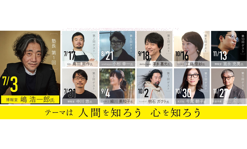 広告未来塾第7期 開催中 「広告未来塾」第7期は嶋浩一郎 氏(博報堂/博報堂ケトル)を塾長に招き、テーマ「人間を知ろう、心を知ろう」のもと、10名のゲスト講師を招いて現在開講期間中です。今回は第3回までの講義の概要をご紹介します。活動報告