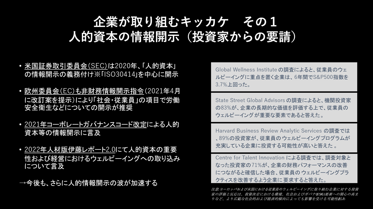 企業がウェルビーイングを意識し、取り組みを進めるキッカケの一つ目は、グローバル全体で起こっている人的資本の情報開示の流れです。
