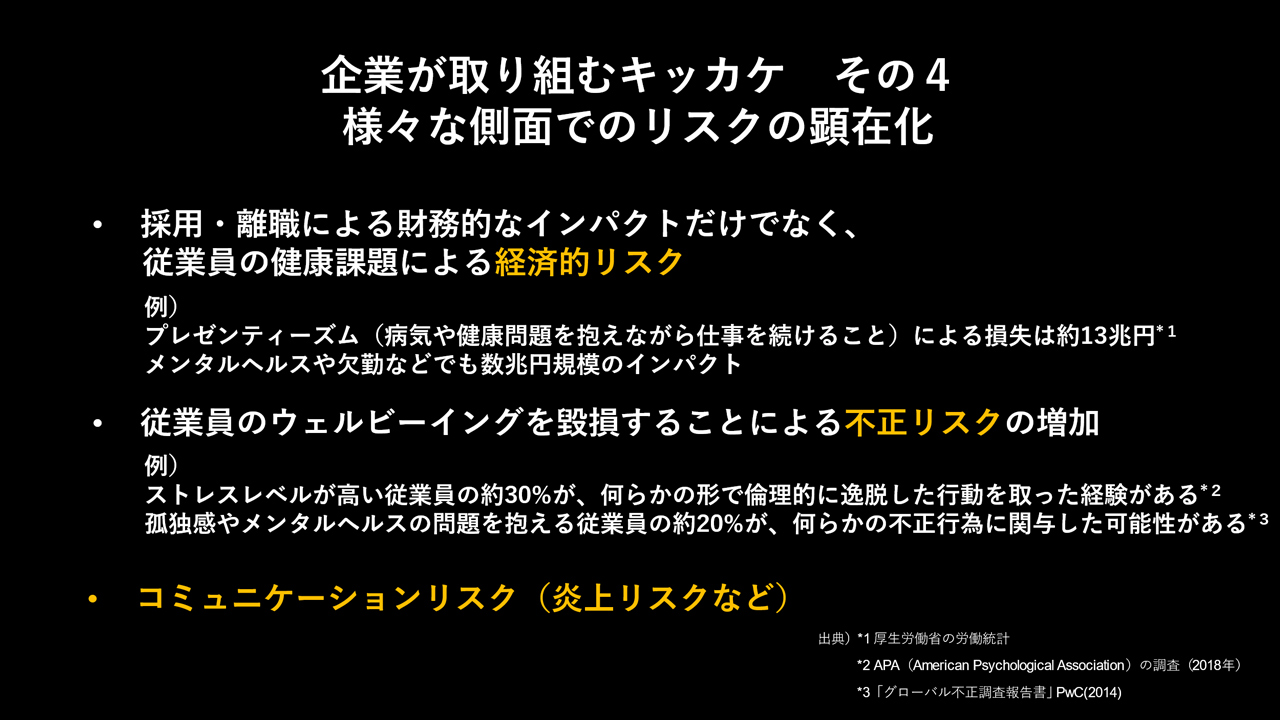 従業員のウェルビーイング(特に心身)を損ねることによる労務的リスクや、それに付随する経済的損失については取り上げられることは多いですが、それだけでなく、従業員のウェルビーイングを損ねることによって、人為的な不正への関与が増加するなど、経営において様々な場面で影響を及ぼします。