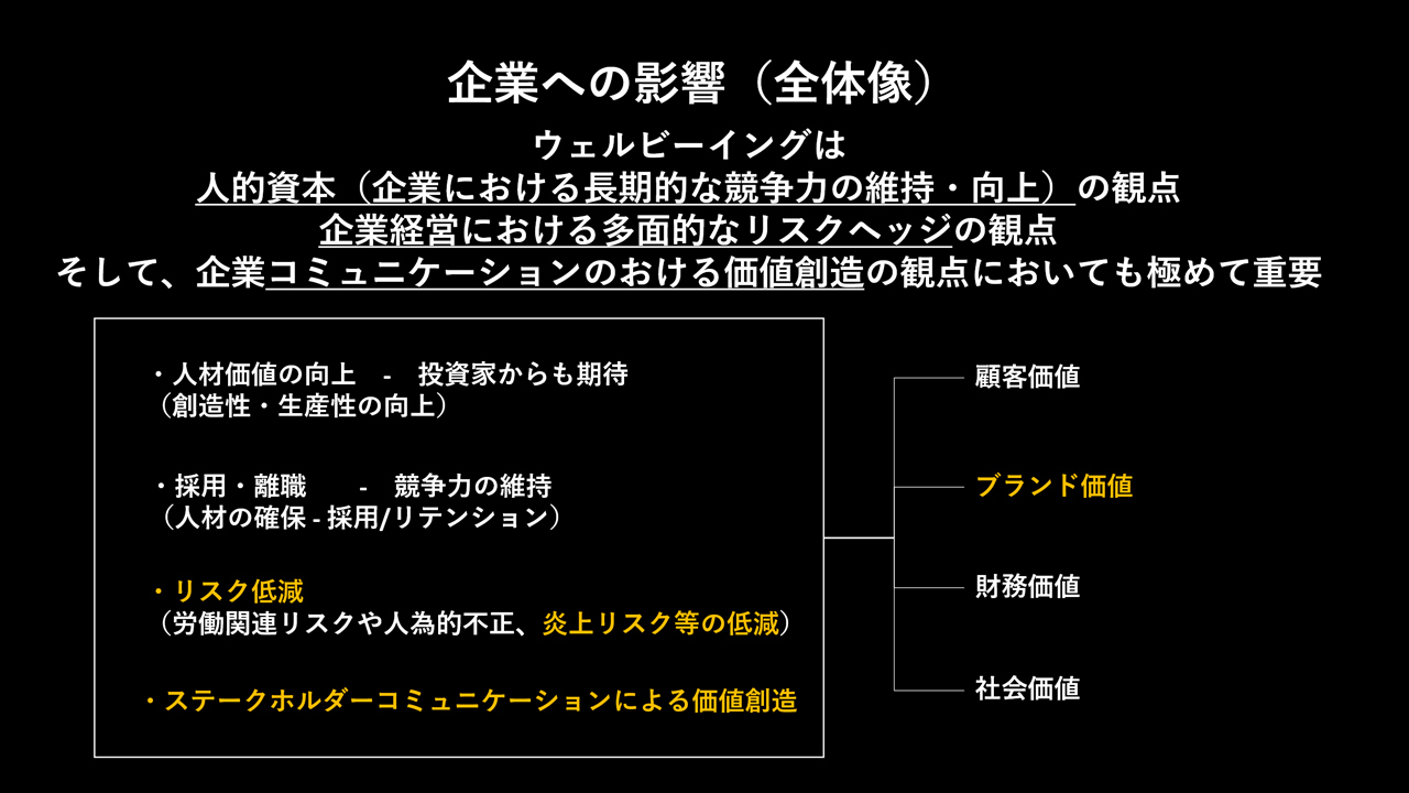 上記の4つのきっかけより、ウェルビーイングに取り組む全体像として、人的資本(採用力や個々のパフォーマンス発揮など企業における長期的な競争力の維持・向上)の観点、企業経営における多面的なリスクヘッジの観点において非常に重要と言えます。