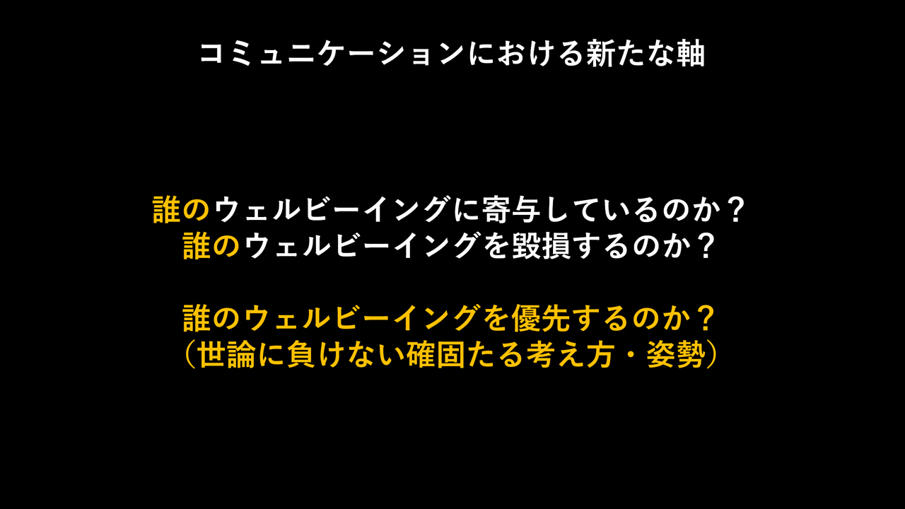 そのため、これからのコミュニケーションにおける新たな軸として、ステークホルダーのウェルビーイングへの配慮というだけではなく、企業理念や姿勢に基づいたコミュニケーションの意思決定が必要になります。