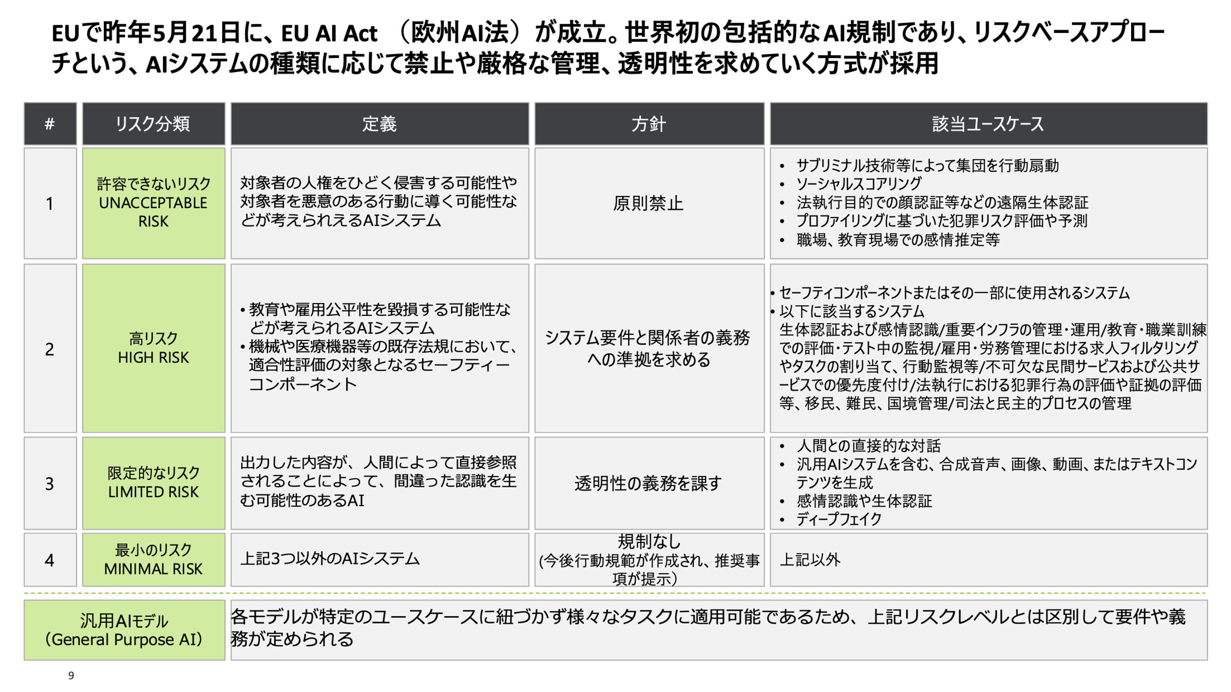 EUでは、2024年5月に世界初の包括的なAI規制として「EU AI Act」が承認されました。同規制では、AIのユースケースに基づいてリスクを分類し、禁止や管理の対象や違反時の罰金が設定されています。