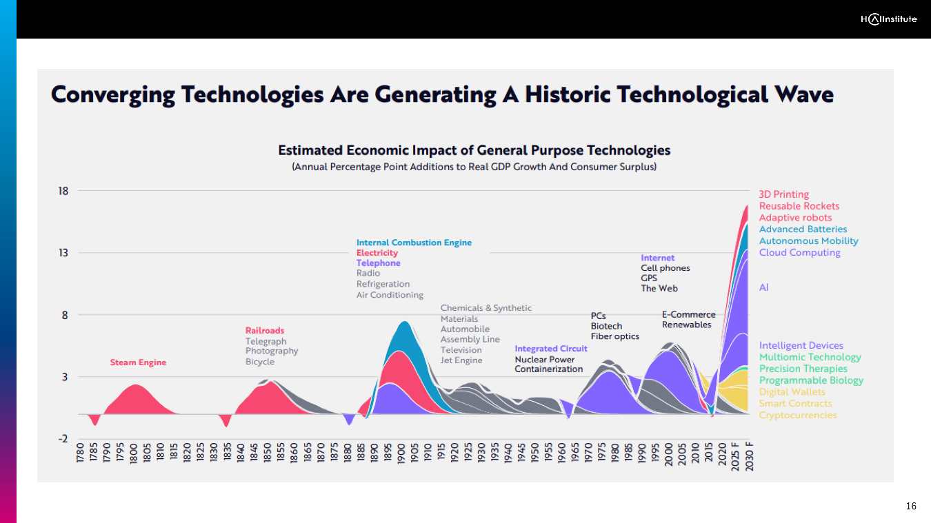 下図は、過去のイノベーションがどのように起きてきたかを可視化したものです。この図が示すのは、「単一の技術は産業を大きく変えることはない」という示唆です。「電気と電話」「インターネットと携帯電話」のように、ある技術と他のものとの組み合わせによって産業変革は実現されてきました。