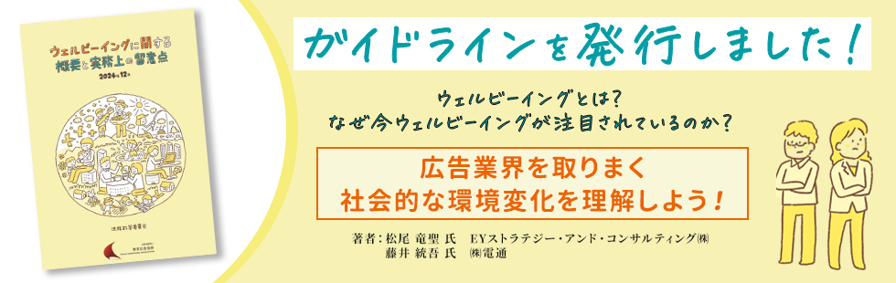 このような幅広いステークホルダーや多岐にわたる課題に対して、人間社会全体が目指す「ウェルビーイングな社会」を実現していくために、まずはウェルビーイングに関する理解を深めていただき、「多くの人に分かりやすく、より伝わりやすい表現を実現する」という広告業界のこれまでの意義を超えて、これからの広告業界、広告表現や広告活動はどのようなことに留意しながら、ウェルビーイングな社会の構築に良いインパクトを与えていけるかを考える一助になればと本ガイドラインを作成しました。